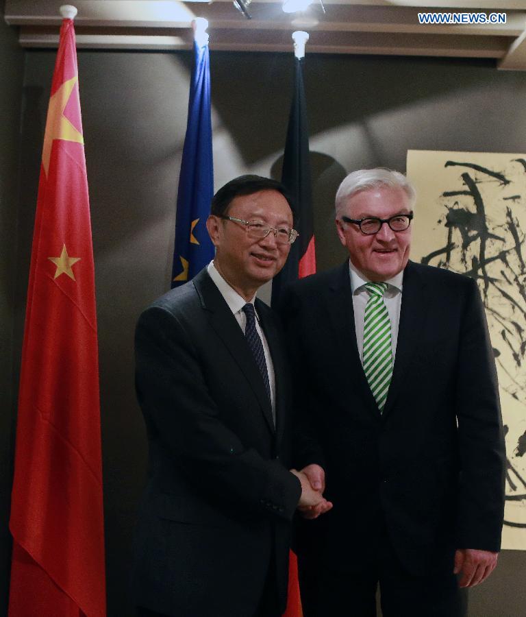 | Chinese State Councilor Yang Jiechi (L) meets with German Foreign Minister Frank-Walter Steinmeier, in Munich, Germany, on Feb.7, 2015. (Xinhua/Luo Huanhuan) |