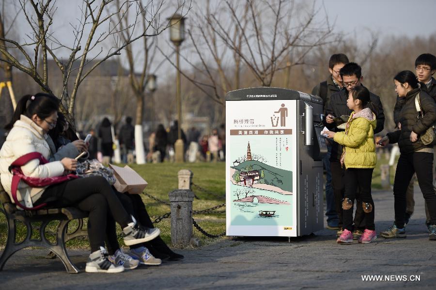 People take a look at a solar power aptitude compressing dustbin newly set in the West Lake scenic spot in Hangzhou, capital of east China's Zhejiang Province, Feb. 7, 2015. Ten suits of solar power aptitude compressing dustbins were set here on Saturday, which could automatically compress trashes thrown in. (Xinhua/Ju Huanzong)