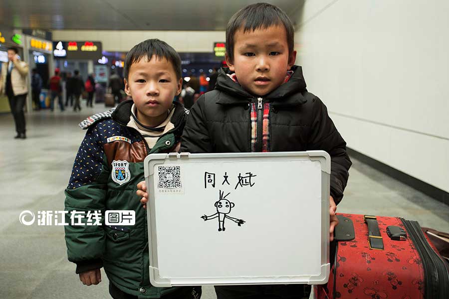 Zhou Wenbin, 7, draws a mini figure and writes down his name when being asked what his New Year wish is.(Photo/zjol.com.cn)