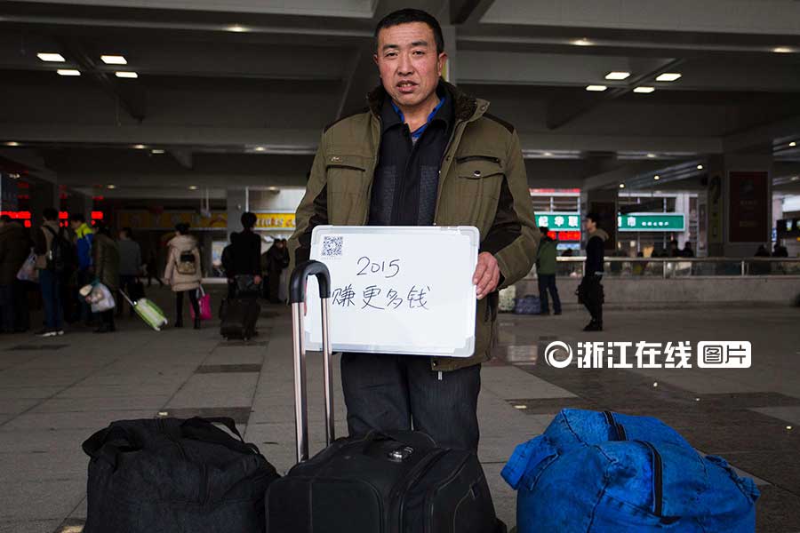 Wang Hongbo, a construction worker, feels happy for getting paid for his work before his departure for his hometown. He hopes to earn more money and have good health in the future. (Photo/zjol.com.cn)