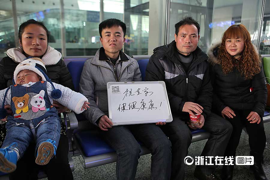 Yang Long works with his parents in Hangzhou. It is the first time for him to take his newlywed wife and newborn boy back to his hometown this year. He wishes his family members safe in 2015.