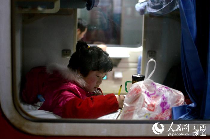 With the approaching of China's lunar new year, or the Spring Festival, more and more people have embarked on their journey to return home in Chunyun or the Spring Festival travel rush, the world's biggest travel rush. On the late night of Feb. 7, People's Daily Online reporters shot the expression of passengers in the carriages at the Nanchang station, which is the only provincial hub station along the Beijing-Kowloon Railway. Most of them looked tired but were happy because they would reunite with their families after one night travel. (People.com.cn/Photo)