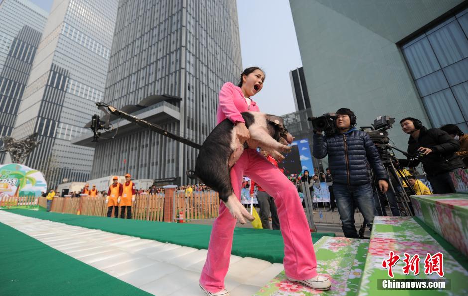 A fun race is held in Changsha, central China’s Hunan province on Feb. 8, 2015. The participants were required to run on a 20 meters long ice track with a pig in arms and kiss the pig at the end point. (Chinanews/Yang Huafeng)