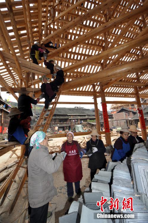 Dong people (a minority of China) build a drum tower to welcome the Chinese New Year in Pingyan village of Sanjiang county, south China’s Guangxi Zhuang autonomous region on Feb. 7, 2015. The drum tower is regarded as the soul of a Dong village and the construction is funded by all the villagers. (Chinanews/Gong Pukang)