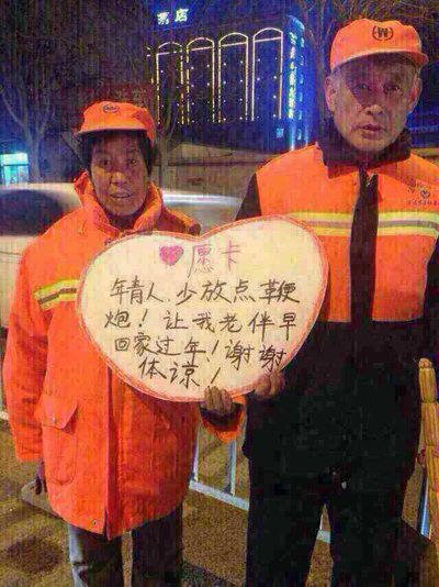 A recent picture has gone viral on social networks: two elderly cleaning workers stand in the cold wind holding a big card carrying the message: "Young men, set off less fireworks, so my old pal can go home earlier! Thank you!" Many netizens have expressed their support.