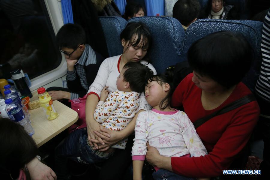 Children have a sleep in parents' arms on train 3663, which runs from east China's Shanghai to Chengdu, capital of southwest China's Sichuan Province, on Sept. 9, 2015. The Spring Festival, or the Chinese lunar New Year which starts from Feb. 19 this year, is known as the world's biggest migration, with millions of people traveling vast distances for family reunions. (Xinhua/Ding Ting)