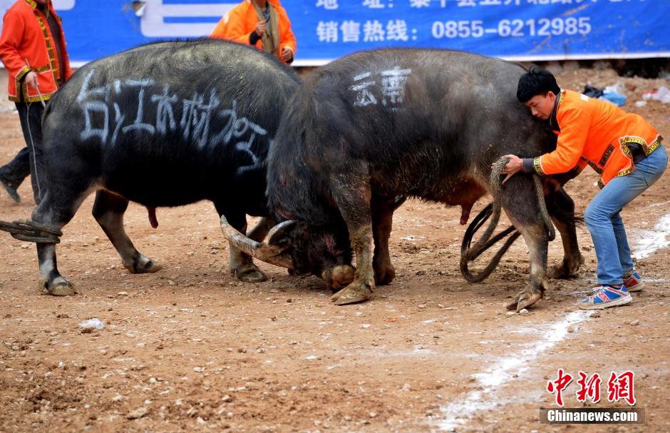 The “2015 International Bull Fighting Competition” is held in southwest China’s Guizhou province on Feb. 8, 2015. Over 130 fighting bulls from China, Vietnam, Laos, Thailand and other countries participated in the competition. (Chinanews/Lin Shizhen)