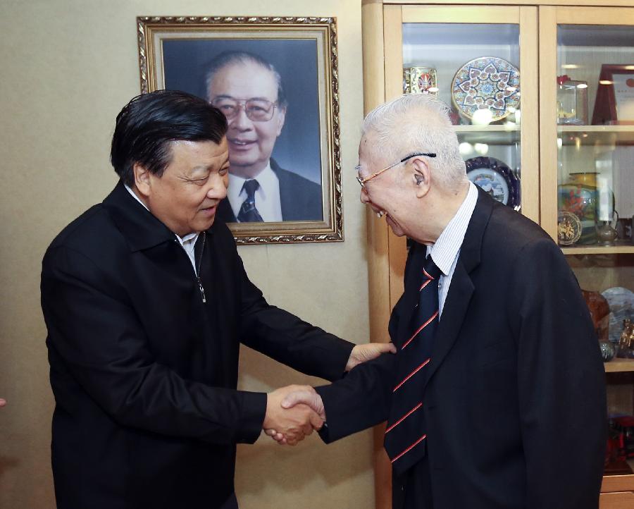 Liu Yunshan (L), a member of the Standing Committee of the Political Bureau of the Communist Party of China (CPC) Central Committee, visits physical chemist Zhang Cunhao, who is an academician at the Chinese Academy of Sciences, in Beijing, China, Feb. 11, 2015. On behalf of President Xi Jinping and the CPC Central Committee, Liu extended festival greetings to scientists ahead of the Lunar New Year, which falls on Feb. 19 this year. (Xinhua/Ding Lin)