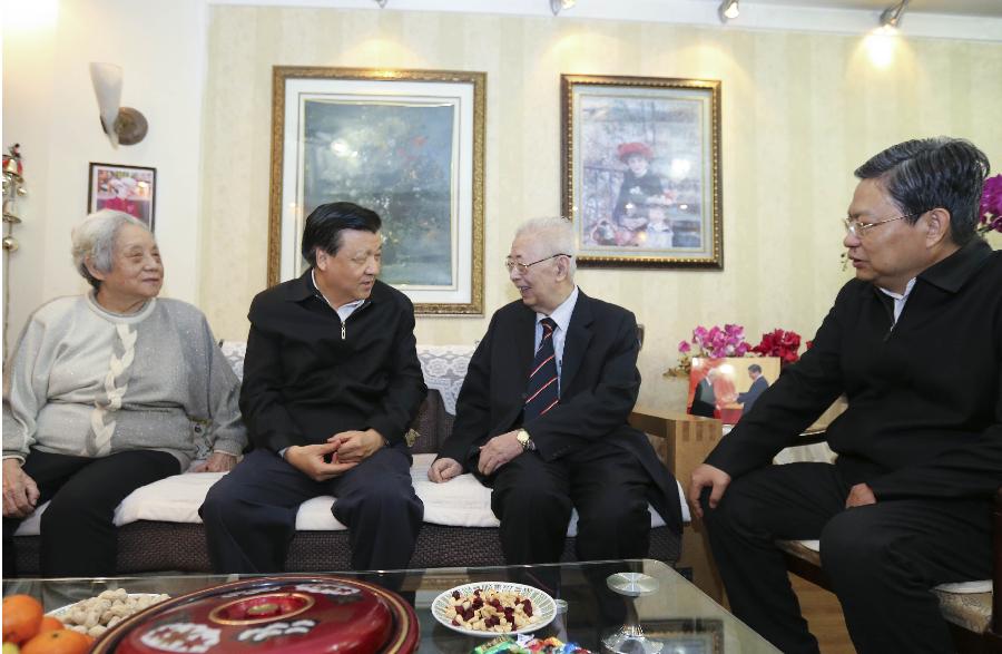 Liu Yunshan (2nd L), a member of the Standing Committee of the Political Bureau of the Communist Party of China (CPC) Central Committee, visits physical chemist Zhang Cunhao (2nd R), who is an academician at the Chinese Academy of Sciences, in Beijing, China, Feb. 11, 2015. On behalf of President Xi Jinping and the CPC Central Committee, Liu extended festival greetings to scientists ahead of the Lunar New Year, which falls on Feb. 19 this year. (Xinhua/Ding Lin)