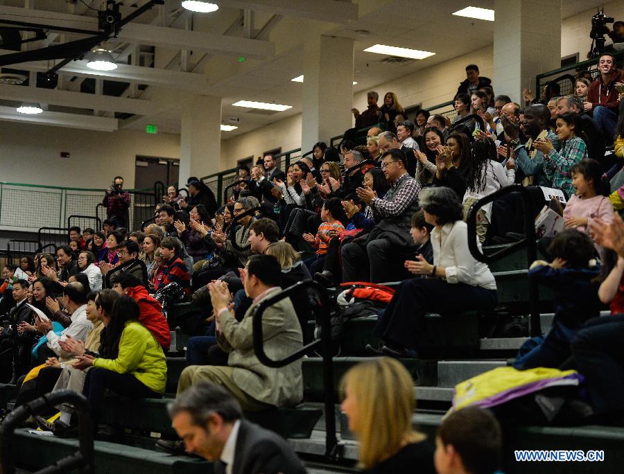 Audiences clap hands for the performance of students from the High School Affiliated to Renmin University of China in Washington Feb. 12, 2015. The art troupe of the High School Affilicated to Renmin University of China performed in Washington to celebrate the upcoming Chinese lunar New Year. (Xinhua/Bao Dandan)