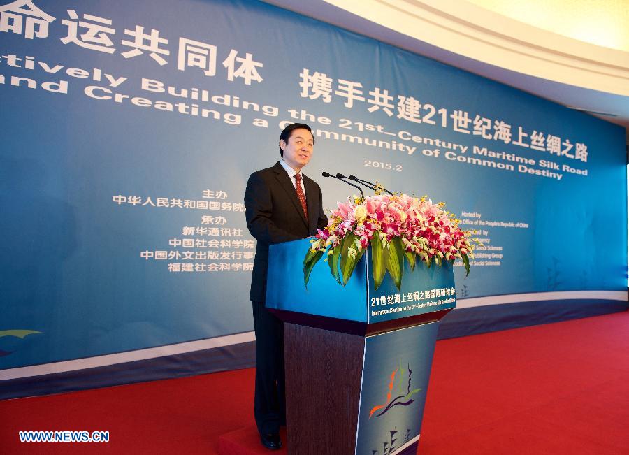| Liu Qibao, a member of the Political Bureau of the Communist Party of China (CPC) Central Committee and the Secretariat of the CPC Central Committee, who is also head of the CPC Central Committee's Publicity Department, delivers a keynote speech at the international seminar on the 21st Century Maritime Silk Road held in Quanzhou, southeast China's Fujian Province, Feb. 12, 2015. (Xinhua/Jiang Kehong) |