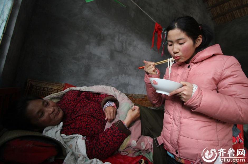 Left-behind girl Zhang Mingyan, 11, takes care of her bedridden mother alone. Her mother has serious spinal problems and can’t get out of bed. Her father has gone out to work for a long time. The little girl supports the whole poor family. (iqilu.com/Qi Jingfeng))