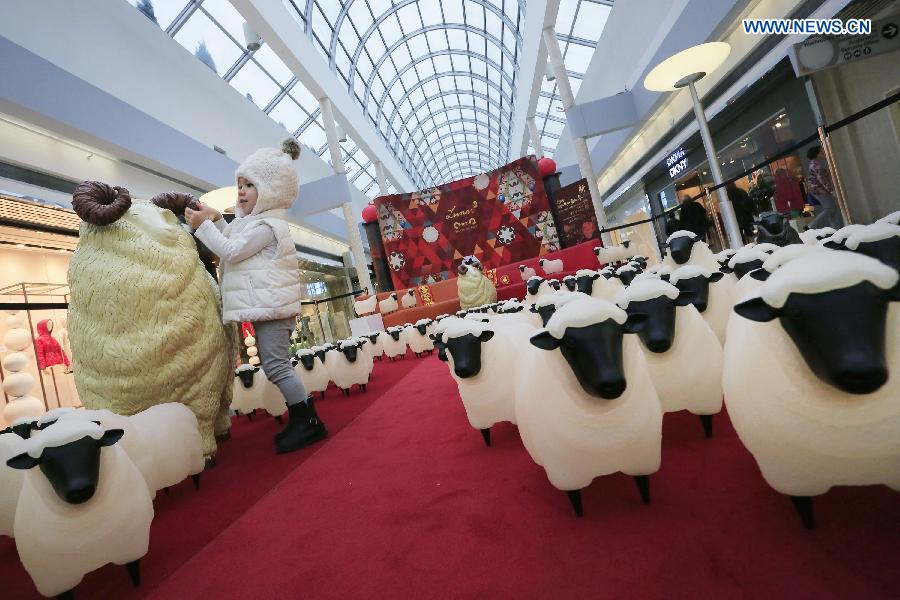 A kid is attracted by the sheep lanterns displayed at a shopping mall in Vancouver, Canada, Feb. 12, 2015. About 180 sheep lanterns are installed at a shopping mall in Vancouver to celebrate the upcoming lunar year of the Sheep. (Xinhua/Liang Sen)