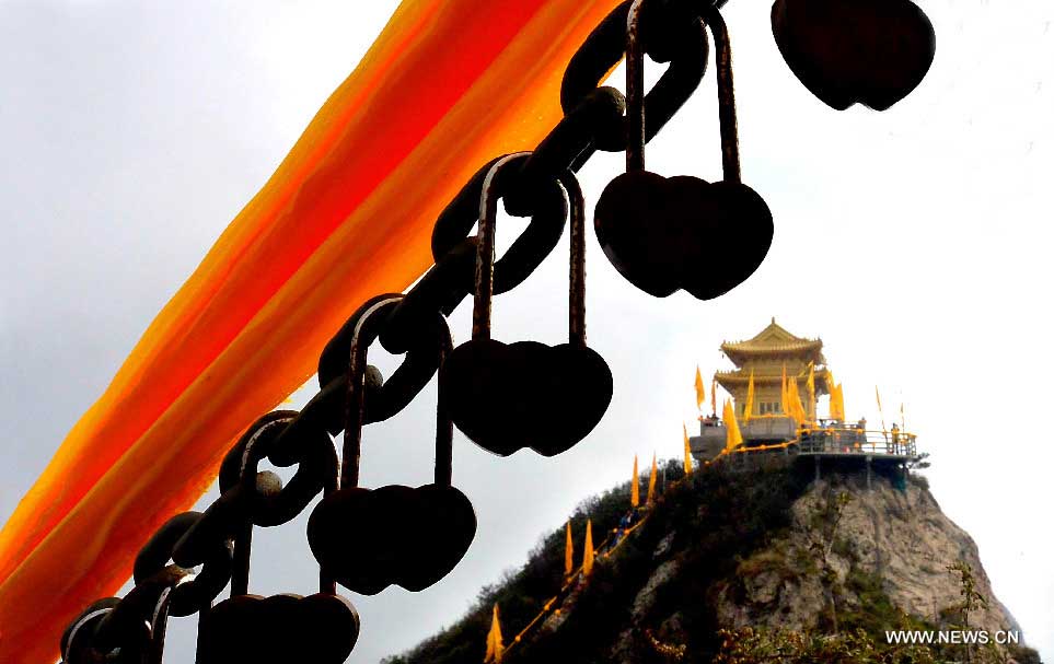 Photo taken on Sept. 21, 2012 shows "love locks" on the iron chain on the Laojun Mountain in Luanchuan County, central China's Henan Province. "Lovelocks", usually seen in scenic spots in China and written with thenames of the lovers, symbolize love of loyalty and sincerity foreach other. (Xinhua/Wang Song)