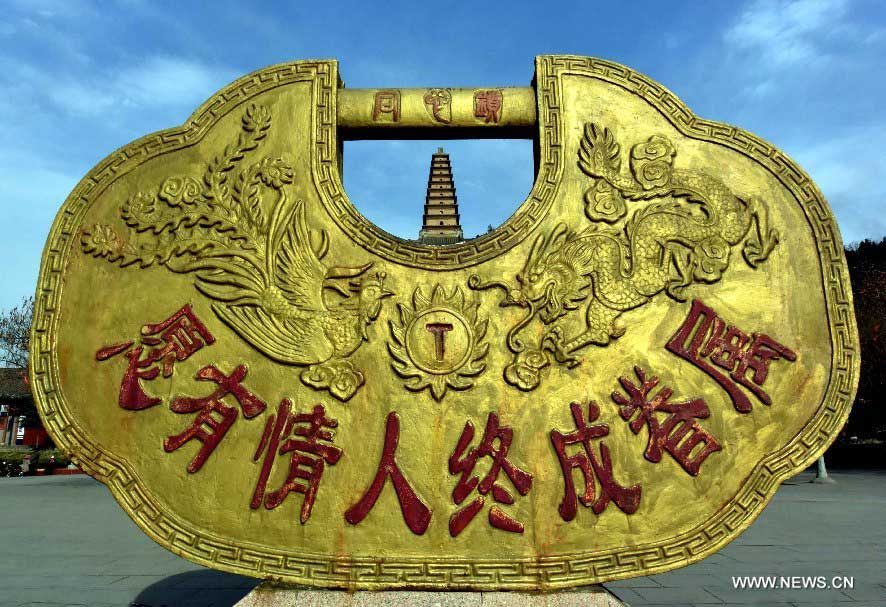 Photo taken on Dec. 15, 2014 shows a "love lock" sculpture in front of the Pujiu Temple in Yongji City, north China's Shanxi Province. "Love locks",usually seen in scenic spots in China and written with the names ofthe lovers, symbolize love of loyalty and sincerity for each other.(Xinhua/Wang Song)