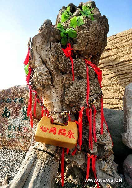 | Photo taken on Oct. 21, 2010 shows a huge "love lock" on a stub at the gate of the Xibu film amusement park in northwest China's Ningxia Hui Autonomous Region. "Love locks", usually seen in scenic spots in China and written with the names of the lovers, symbolize love of loyalty and sincerity for each other. (Xinhua/Wang Song) |