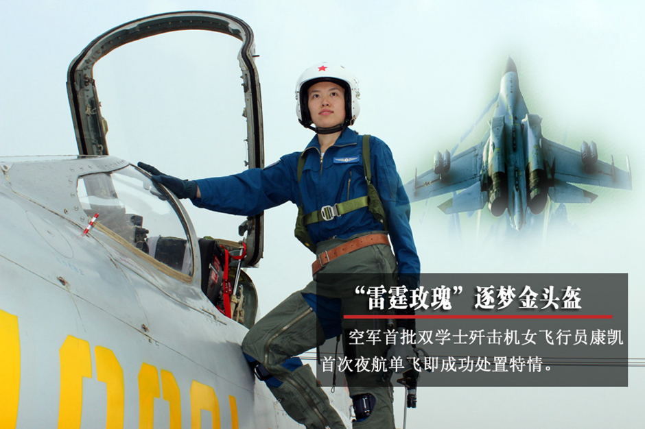 Kang Kai is proud to be one of the first female fighter pilots with double degrees. In 2008, she was among the 33 girls selected from more than 150,000 senior high school students as a potential pilot. After a rigid training regime, she became one of the ten female fighter pilots in the People's Liberation Army air force.