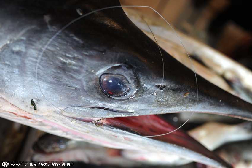 A swordfish measuring 2.77 meters long and weighing 135 kilograms is for sale at a fish stall in Qingdao, east China’s Shandong province. The fish was caught by local fishermen in the Yellow Sea near Qingdao. (CFP/Wang Haibin)