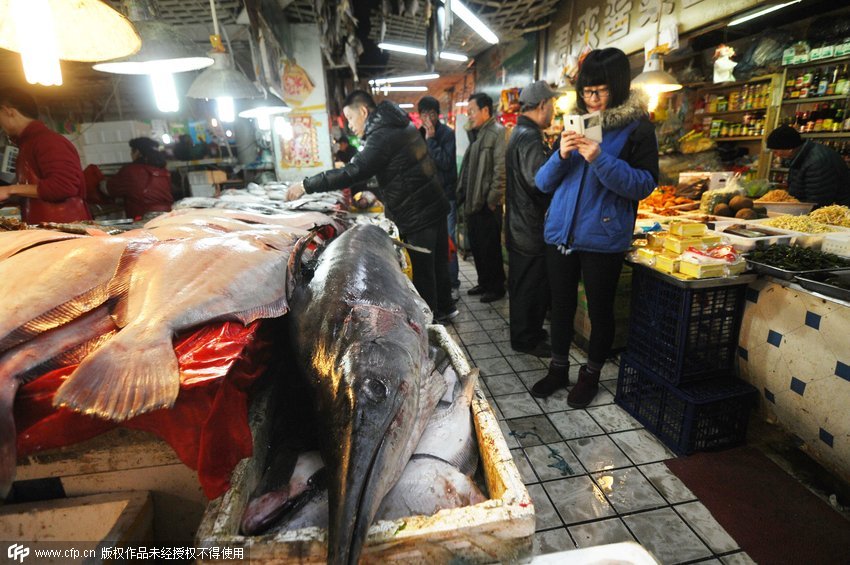 A swordfish measuring 2.77 meters long and weighing 135 kilograms is for sale at a fish stall in Qingdao, east China’s Shandong province. The fish was caught by local fishermen in the Yellow Sea near Qingdao. (CFP/Wang Haibin)