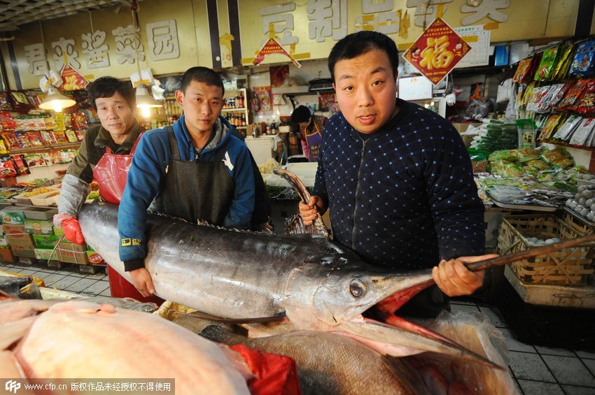 A swordfish measuring 2.77 meters long and weighing 135 kilograms is for sale at a fish stall in Qingdao, east China’s Shandong province. The fish was caught by local fishermen in the Yellow Sea near Qingdao. (CFP/Wang Haibin)