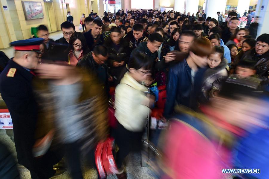 Passengers move to board a train in Heifei Railway Station in Hefei, capital of esat China's Anhui Province, Feb. 15, 2015. The Heifei Railway Station is expecting to handle 880,000 trips on Sunday, four days ahead of the Spring Festival. Taking place annually ahead of the Spring Festival holiday, the travel spree, known as "Chunyun" in Chinese, is considered the world's largest human migration, with hundreds of millions of Chinese people traveling home to reunite with family. (Xinhua/Du Yu)
