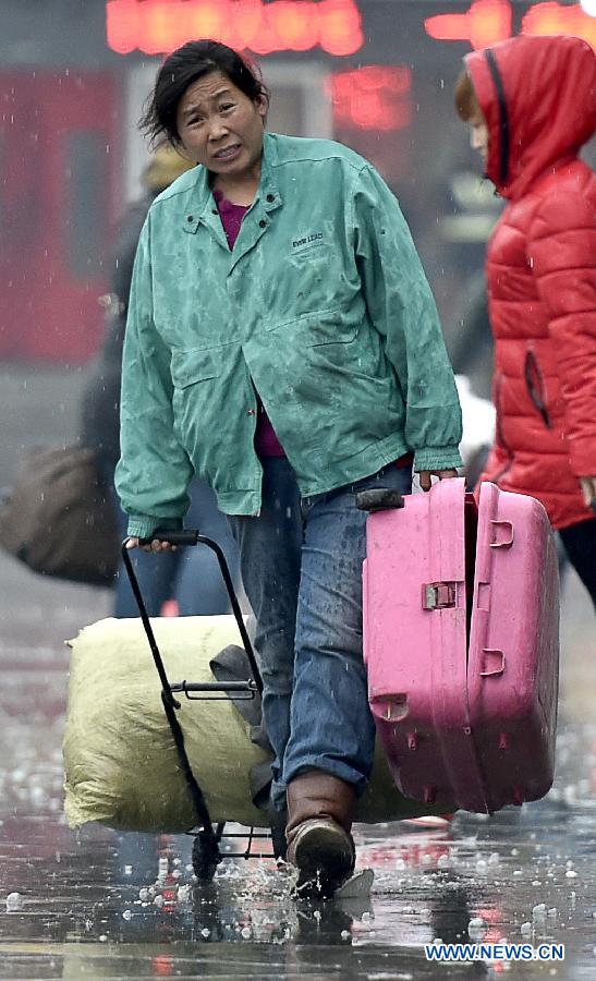 | A passenger walks in the rain at Tianjin railway station in Tianjin, north China, Feb. 15, 2015. A rainfall hit the city Sunday. (Xinhua/Yue Yuewei) |