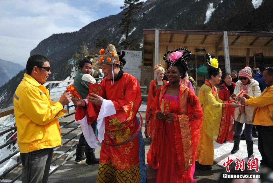 Located in southwest China’s Sichuan province, Hailuogou Valley is the lowest glacier zone in the world, and is a famous natural park in China. From Feb. 14 to Feb. 15, 2015, a group of “ancient beauties” played by models appeared at Hailuogou to attract tourists. Some models were dressed as the “God of Wealth” and handed out red envelopes to tourists. (Chinanews/Liu Zhongjun)