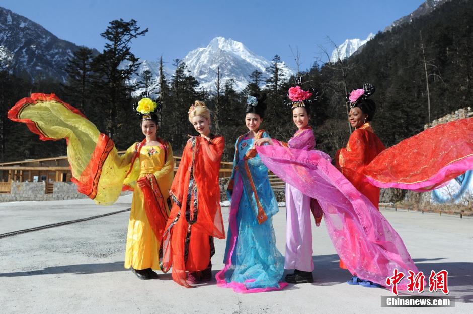 Located in southwest China’s Sichuan province, Hailuogou Valley is the lowest glacier zone in the world, and is a famous natural park in China. From Feb. 14 to Feb. 15, 2015, a group of “ancient beauties” played by models appeared at Hailuogou to attract tourists. Some models were dressed as the “God of Wealth” and handed out red envelopes to tourists. (Chinanews/Liu Zhongjun)