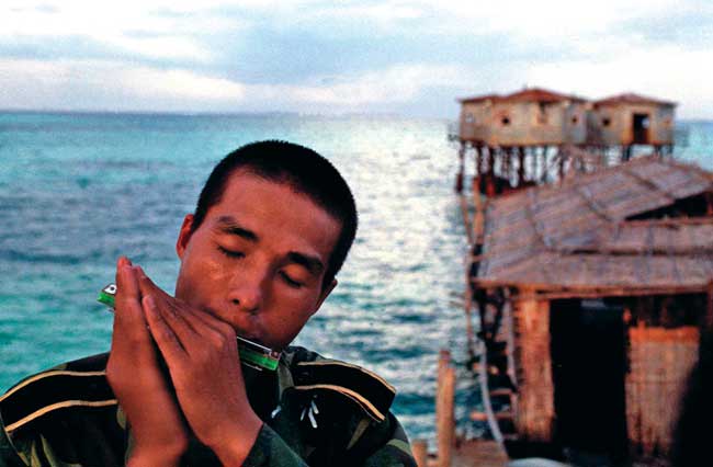 | A soldier blowing the harmonica on the Nansha islands. (Chinese Ministry of Defense/Zhou Chaorong) |