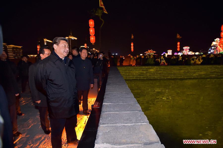 Chinese President and General Secretary of the Communist Party of China Central Committee Xi Jinping (front), also chairman of the Central Military Commission, makes an inspection on ancient wall protection in Xi'an, capital of northwest China's Shaanxi Province, Feb. 15, 2015. Xi made a tour in Shaanxi on Feb. 13 - 16, and extended festival greetings to locals and people across the nation ahead of the Spring Festival, which falls on Feb. 19. (Xinhua/Li Tao)