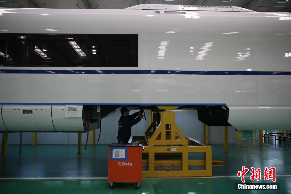Photo shows the birth of high-speed trains at workshops in CNR Tangshan Railway Vehicle Co., Ltd. During the Spring Festival travel rush, known as "chunyun", the high-speed rail plays an irreplaceable role with its high-speed, stability and high-density. In 2014, the CNR export turnover reached 3 billion US dollars, an increase of 68.6 percent compared with the previous year. (CNS/Yang Kejia)