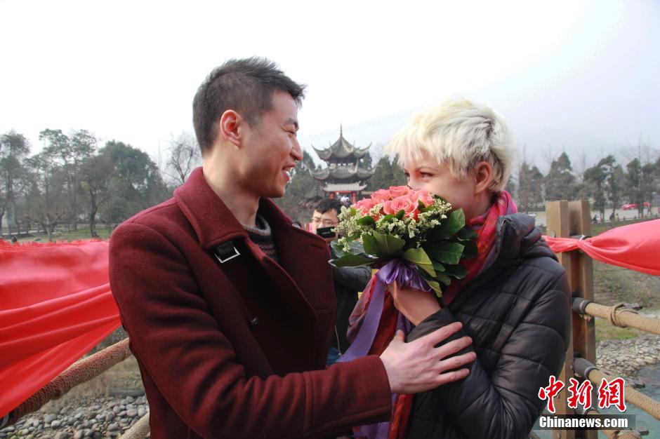 26-year-old Ukraine girl Sasha, dressing in a panda suit, proposes to his Chinese boyfriend on the Valentine's Day in the street of Dujiangyan in southwest China's Sichuan province. One year ago, she came to travel in China and fell in love with her Chinese boyfriend. (Photo/CNS)