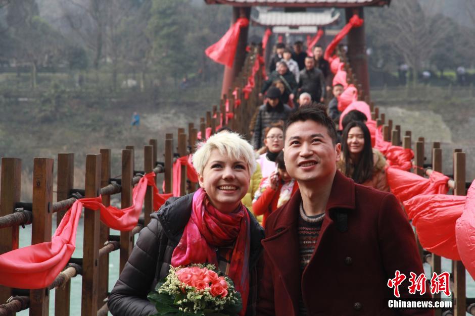 26-year-old Ukraine girl Sasha, dressing in a panda suit, proposes to his Chinese boyfriend on the Valentine's Day in the street of Dujiangyan in southwest China's Sichuan province. One year ago, she came to travel in China and fell in love with her Chinese boyfriend. (Photo/CNS)