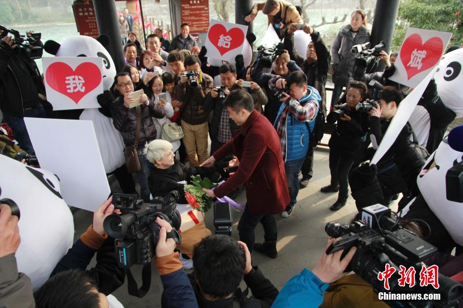 26-year-old Ukraine girl Sasha, dressing in a panda suit, proposes to his Chinese boyfriend on the Valentine's Day in the street of Dujiangyan in southwest China's Sichuan province. One year ago, she came to travel in China and fell in love with her Chinese boyfriend. (Photo/CNS)