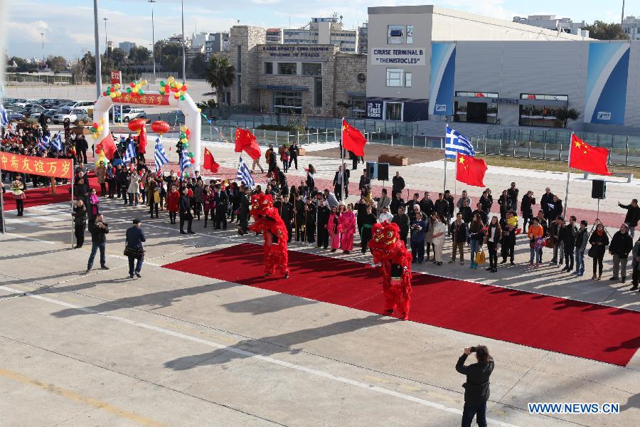 | People perform traditional Chinese lion dance during the welcome ceremony for Chinese naval fleet at the harbour of Piraeus, Greece, Feb. 16, 2015. The 18th Chinese naval escort fleet arrived in the Greek port of Piraeus on Monday morning, commencing a four-day goodwill visit after such visits to Greece in 2002 and 2010. (Xinhua/Zhang Yuelin) |