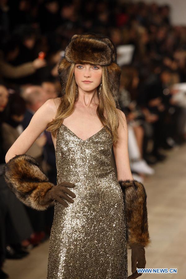 A model presents a creation of Ralph Lauren Fall/Winter 2015 collection during the New York Fashion Week in New York, the United States, Feb. 19, 2015. (Xinhua/Wu Xia)