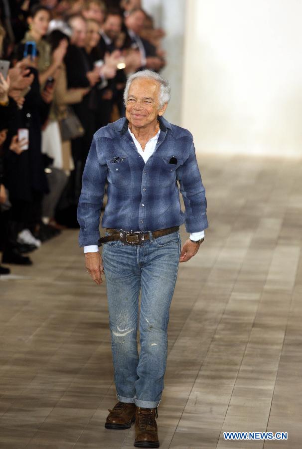 Ralph Lauren greets the audience after his brand show during the New York Fashion Week in New York, the United States, Feb. 19, 2015. (Xinhua/Wu Xia)