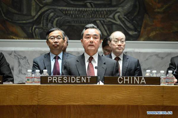 Chinese Foreign Minister Wang Yi (C), who is also president of the UN Security Council for the month of February, presides over a Security Council meeting under the theme of "Maintaining International Peace and Security: Reaffirm the Strong Commitment to the Purposes of the Charter of the United Nations", at the UN headquarters in New York, the United States, on Feb. 23, 2015. The UN Security Council onMonday started a China-proposed open debate on maintaining international peace and security at the UN Headquarters in NewYork. (Xinhua/Niu Xiaolei)