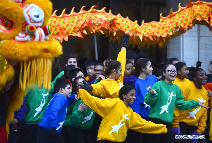 Members of the NDI (National Dance Institute) Celebration Team give a free outdoor performance as a part of the New York Philharmonic's celebration of Chinese New Year, at the Lincoln Center Plaza, New York, the United States, on Feb. 24, 2015. (Xinhua/Wang Lei)