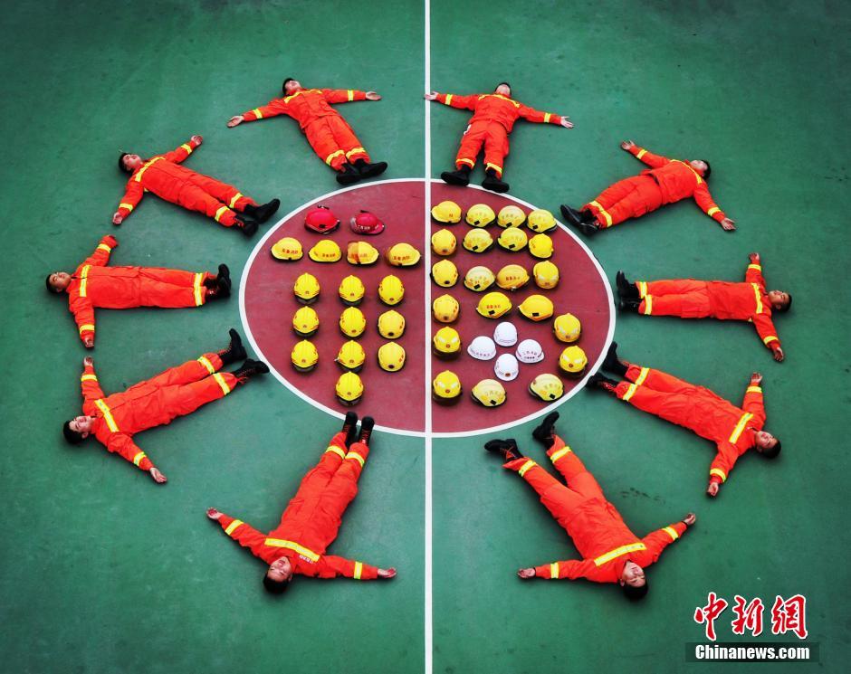 A firefighter team poses for Spring Festival greetings in Yichun, southeast China's Jiangxi province, Feb. 18, 2015. (CNS/Chen Naiguo)