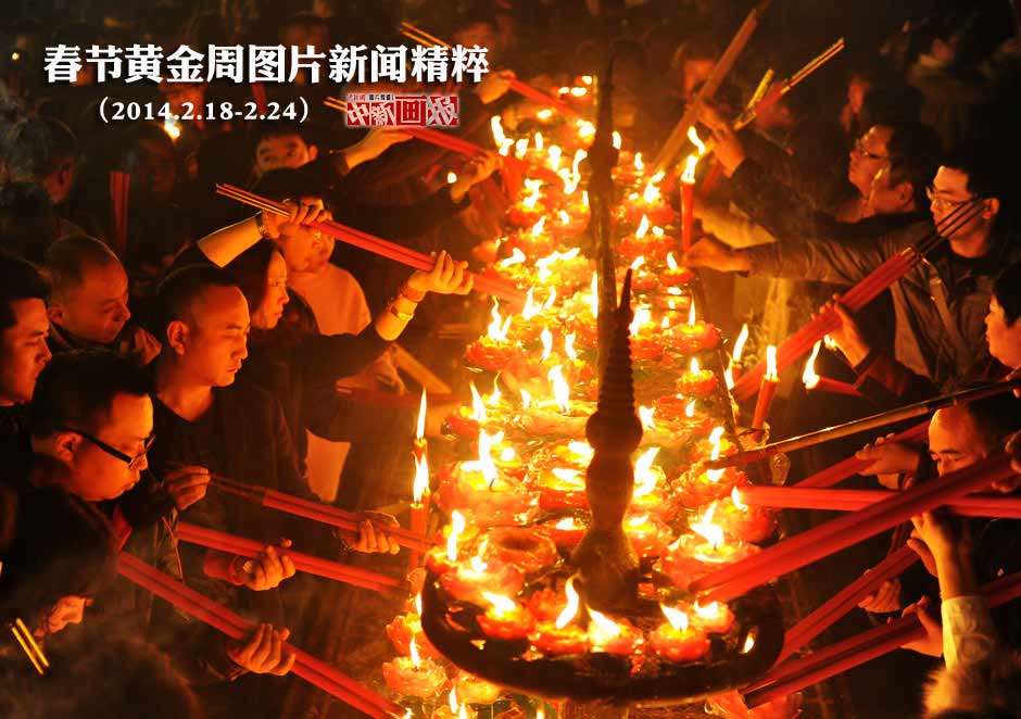 People pray and welcome the Year of the Sheep at the Baoguo Temple on Emei Mountain on the Spring Festival's Eve on Feb. 19, 2015. (CNS/Liu Zhongjun)