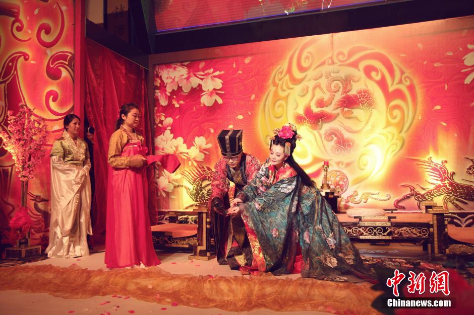 A Chinese couple wears traditional Hanfu at their wedding ceremony in Hangzhou, east China's Zhejiang province on Feb. 23, 2015. (Chinanews.com/Ye Zi)