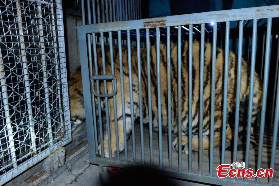 Two illegally-kept tigers are seen being transferred by workers to a wildlife conservation center in Qingdao, East China’s Shandong province on February 26, 2015. The two tigers were found being kept in a high-rise building in Pingdu city with another young tiger which jumped to its death on February 18, Lunar New Year’s Eve. The tiger was frightened by Spring Festival firecrackers and escaped from the cage. (Photo: China News Service/ Yu Fangping)