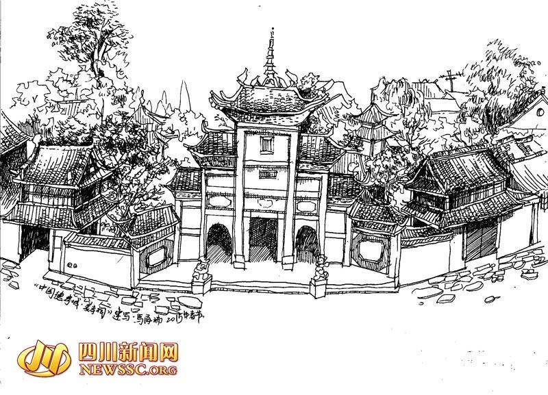 Ma Hairui’s pen sketch of a historical site in Deyang, Southwest China’s Sichuan province during the Spring Festival holiday. (Photo/newssc.org)