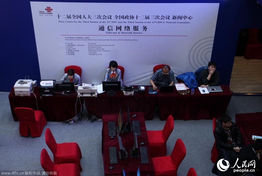 Telecommunications and network service center. The press center for the annual sessions of the National People's Congress (NPC) and the Chinese People's Political Consultative Conference (CPPCC) National Committee is under preparation for the opening of the two-week meetings in Beijing on Feb. 26, 2015. A media center for the major political meetings will open from Feb. 27 at the Media Center Hotel in Beijing. (Song Fan/dfic.cn)