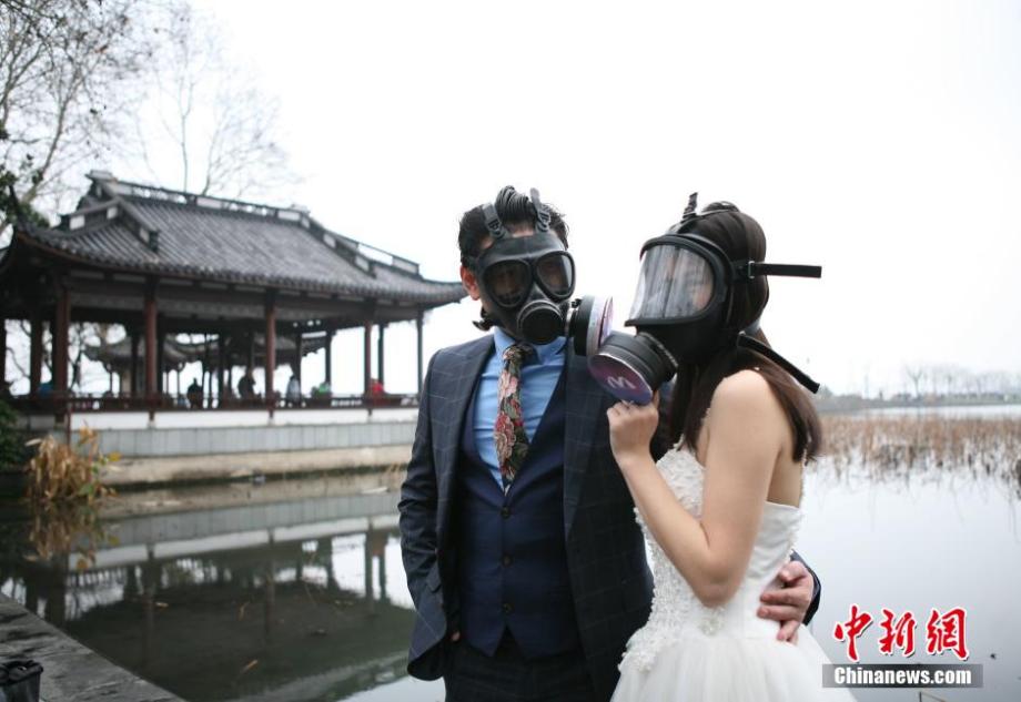 A newly-married couple take wedding photos with gas mask on Feb. 26, 2015, in Hangzhou, east China's Zhejiang province. The bridegroom is a DJ in the city, who advocates environmental protection in daily life. (CNS/Li Chenyun)