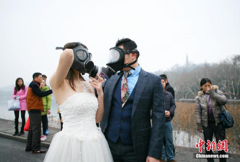 A newly-married couple take wedding photos with gas mask on Feb. 26, 2015, in Hangzhou, east China's Zhejiang province. The bridegroom is a DJ in the city, who advocates environmental protection in daily life. (CNS/Li Chenyun)