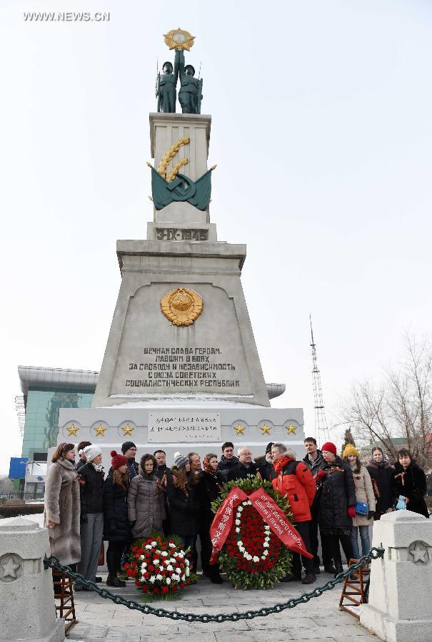 | Representatives of Russians living in Harbin, capital of northeast China's Heilongjiang Province, pose for a group picture after laying flowers at Soviet martyrs monument in Harbin, Feb. 28, 2015. Dozens of Russians living and working in Harbin attended a commemorative activity for Soviet Red Army soldiers who sacrificed during World War II on Saturday. The monument was set up in 1945 to commemorate Soviet soldiers who were killed in the fight against the Japanese invaders in China. (Xinhua/Wang Jianwei) |