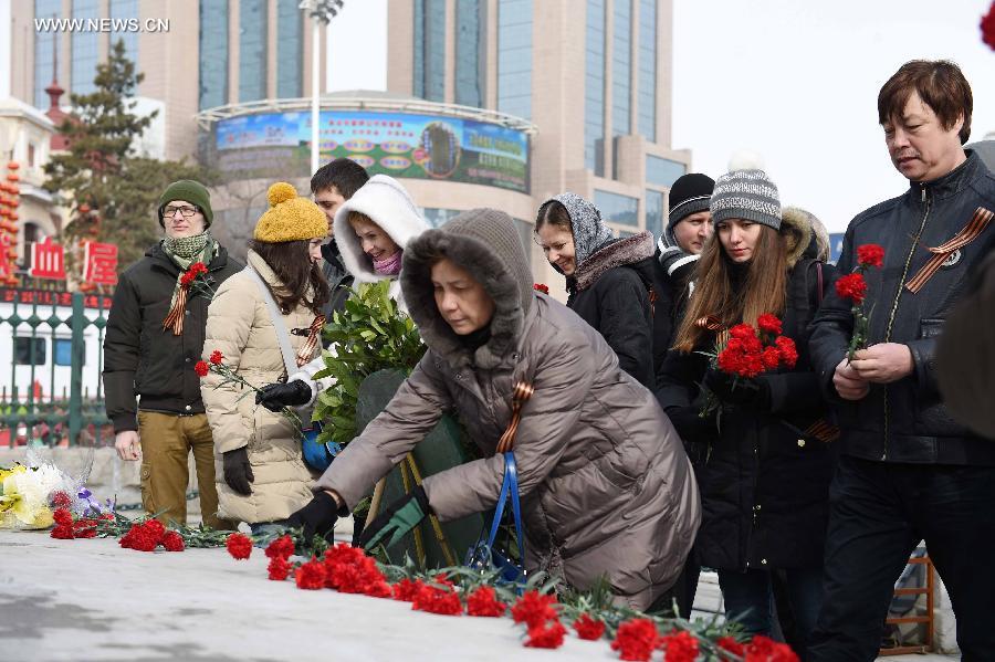Representatives of Russians living in Harbin, capital of northeast China's Heilongjiang Province, present flowers to Soviet martyrs monument in Harbin, Feb. 28, 2015. Dozens of Russians living and working in Harbin attended a commemorative activity for Soviet Red Army soldiers who sacrificed during World War II on Saturday. The monument was set up in 1945 to commemorate Soviet soldiers who were killed in the fight against the Japanese invaders in China. (Xinhua/Wang Jianwei)