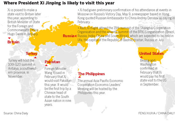Xi visited 18 countries on four continents last year, many of them China's neighbors, and China signed more than 500 cooperation agreements.